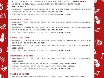W Gdańsku bawiono się w Loopy's World, zwiedzano Muzeum Morskie i starówkę. Z kolei mali kucharze, z pomocą instruktorów i uczestników zajęć Warsztat Terapii Zajęciowej, samodzielnie przygotowywali pizzę, chruściki i popcorn. Ostatni z przysmaków zachęca do skorzystania z promocyjnych feryjnych seansów w Kino za Rogiem w Brusach.