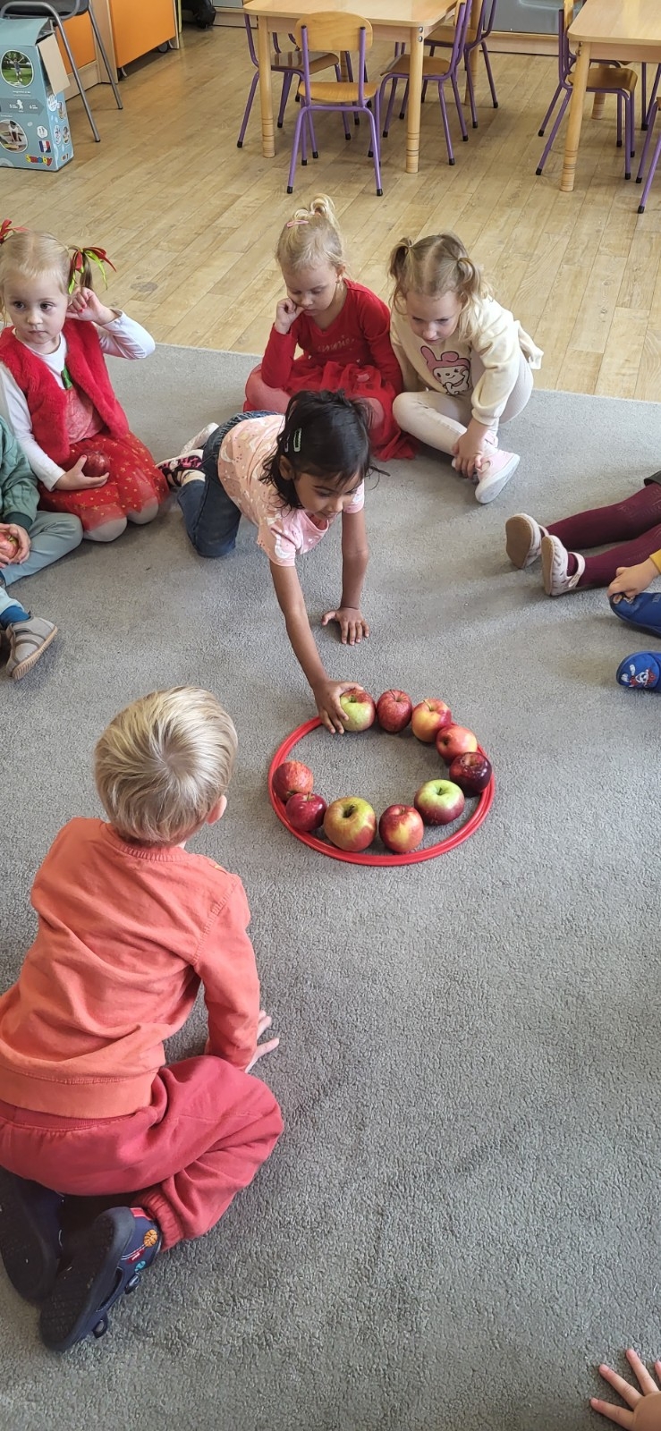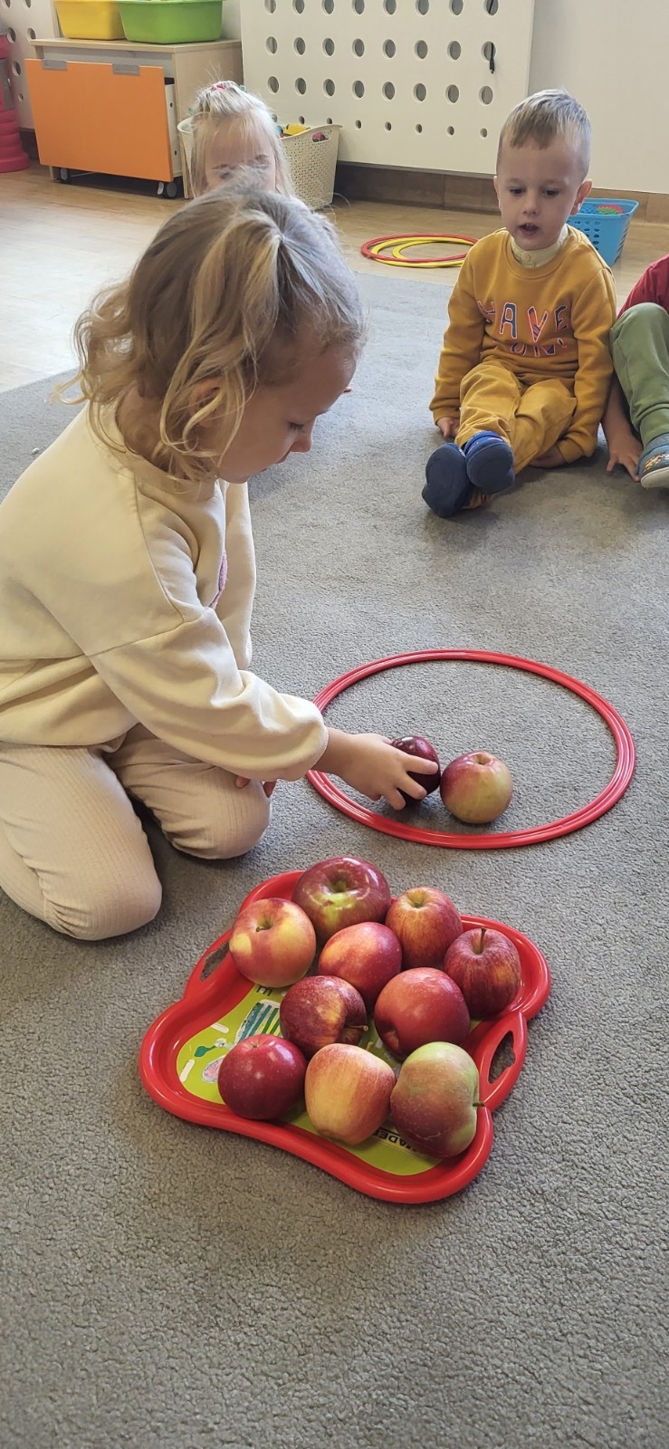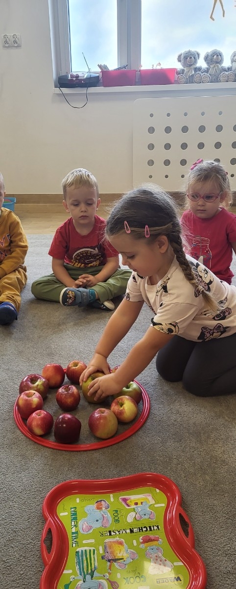 Po krótkiej rozmowie dzieci wykonały jabłuszkowy taniec, podczas którego dzieci z radością poruszały się w rytm muzyki, naśladując spadanie jabłek z drzew i ich turlanie się po sadzie.