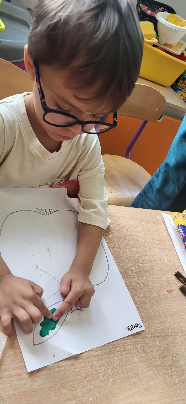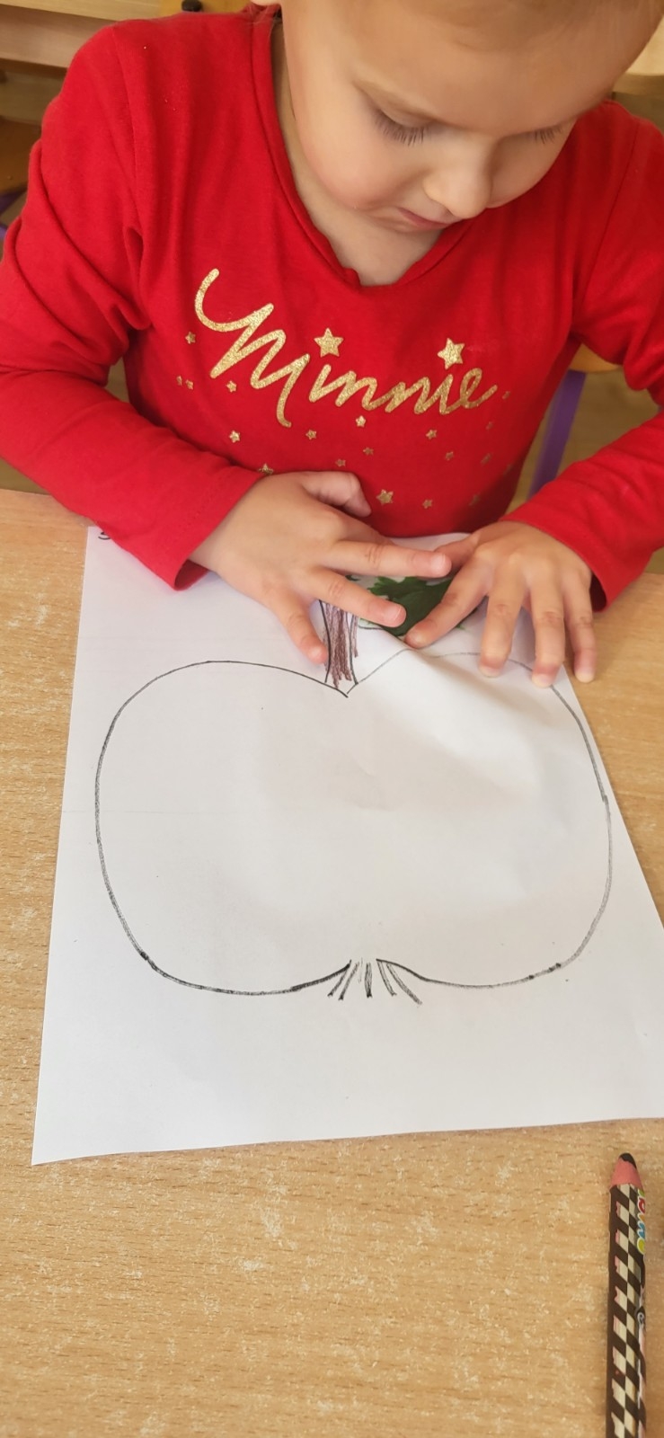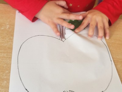 Kolejnym punktem programu był czas na pracę plastyczną – dzieci pomalowały jabłka czerwoną farbą, a zielone listki wykonały, rozcierając plastelinę, dzięki czemu powstały piękne, barwne prace, które ozdobiły naszą salę.