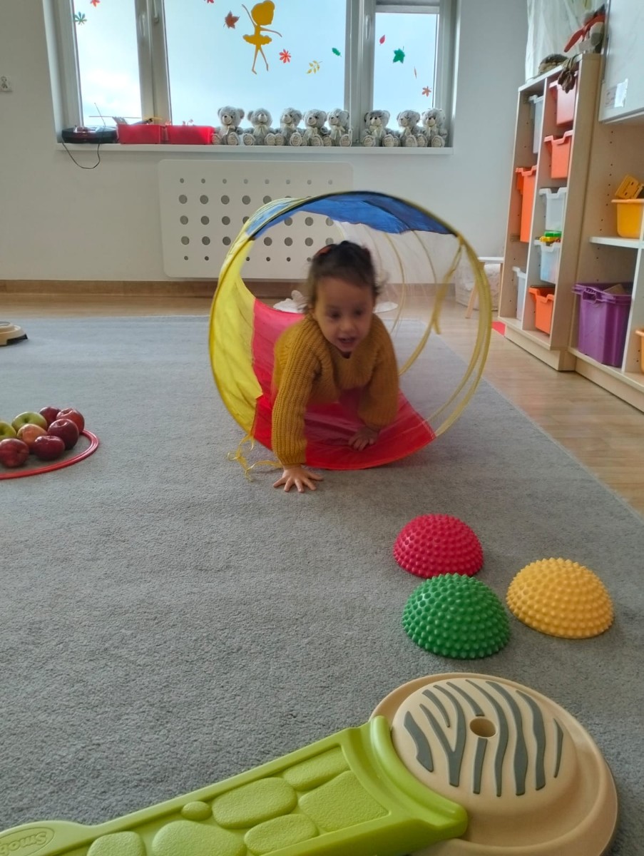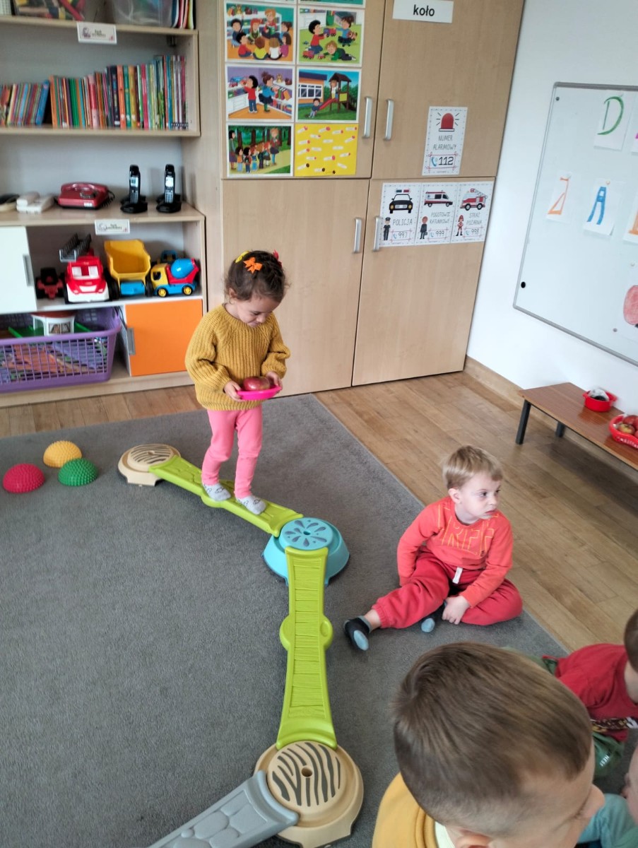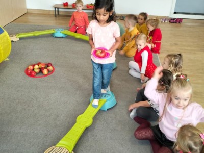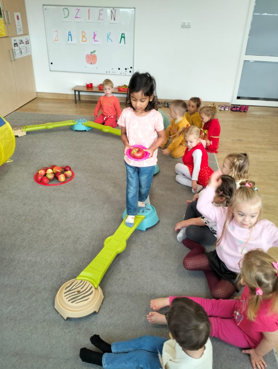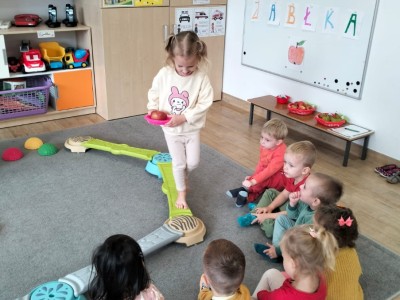 Następnie wzięły udział w wesołej zabawie ruchowej – pokonywały tor przeszkód z jabłkiem niesionym na talerzyku. Zadanie wymagało skupienia i równowagi, ale wszystkie przedszkolaki poradziły sobie znakomicie!