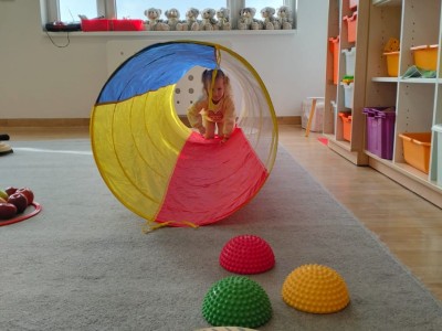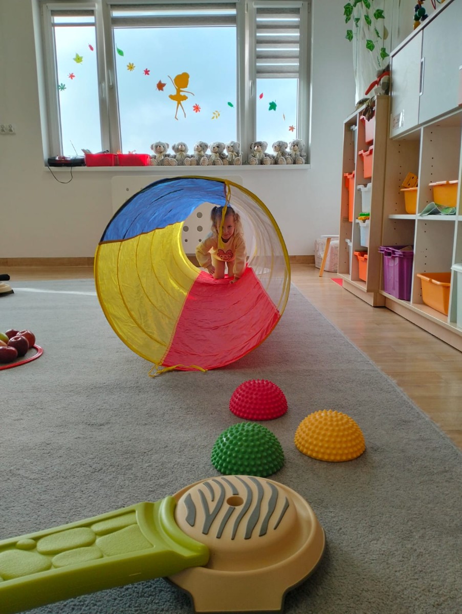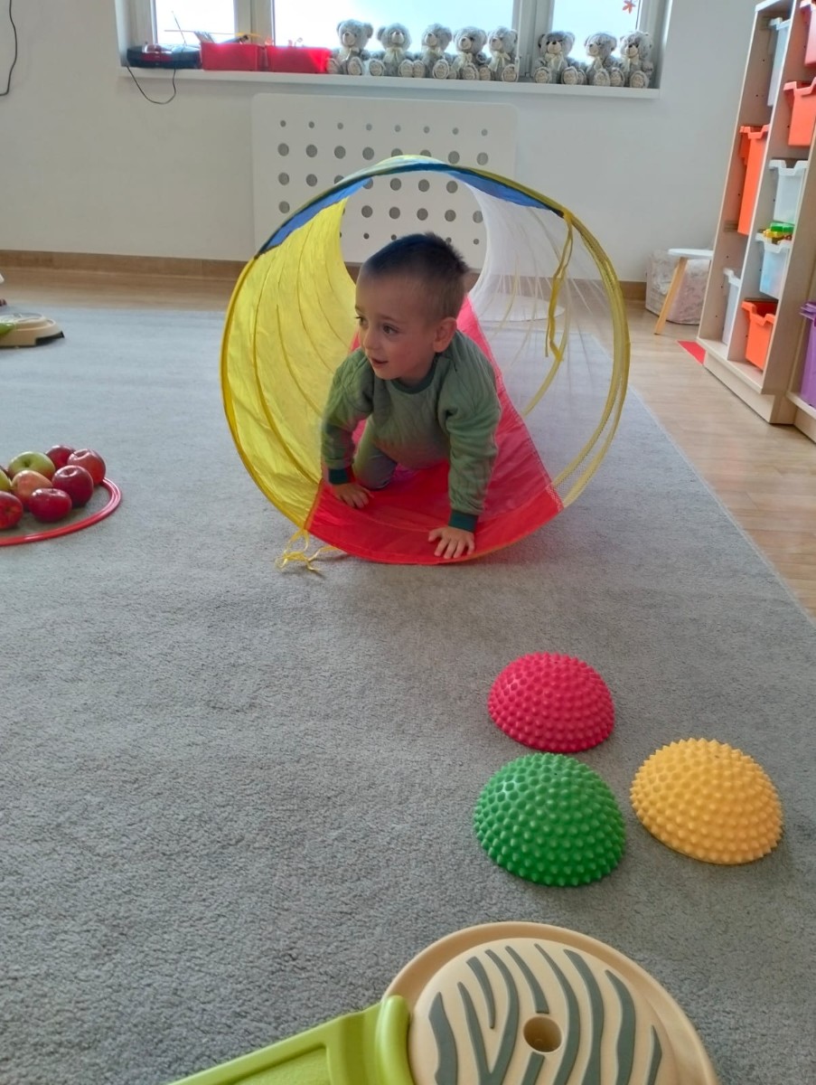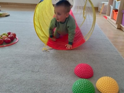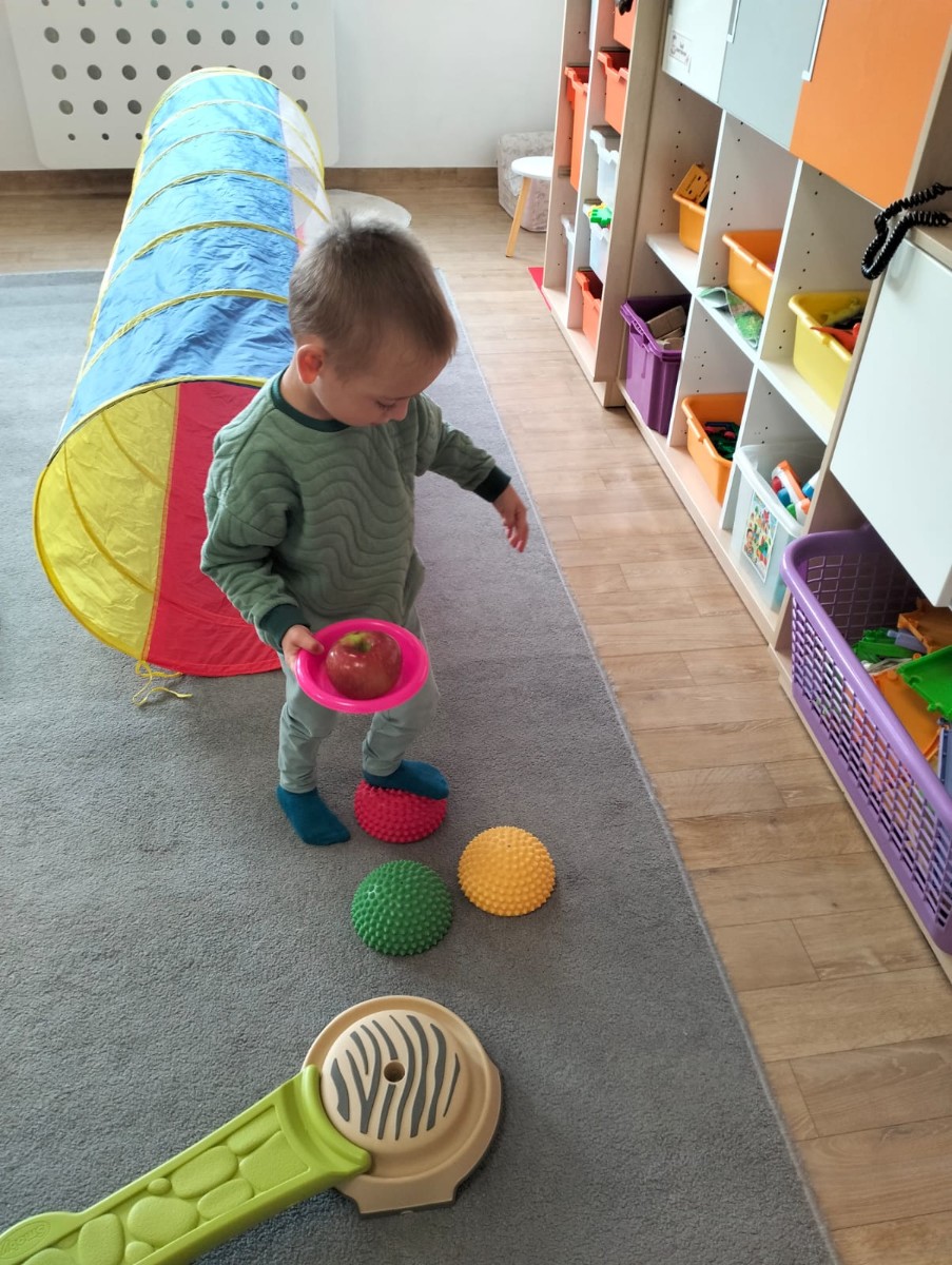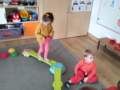 Następnie wzięły udział w wesołej zabawie ruchowej – pokonywały tor przeszkód z jabłkiem niesionym na talerzyku. Zadanie wymagało skupienia i równowagi, ale wszystkie przedszkolaki poradziły sobie znakomicie!