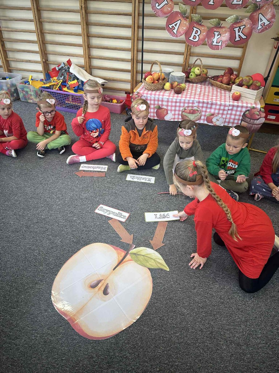 Poznaliśmy i zaśpiewaliśmy wesołą piosenkę „Jabłuszko”, rozmawialiśmy o tym, dlaczego warto jeść jabłka, jakie znamy odmiany, gdzie można je spotkać i kupić, a także z czego składa się jabłko. Dzieci utrwalały swoją wiedzę, dopasowując elementy budowy jabłka do ilustracji.