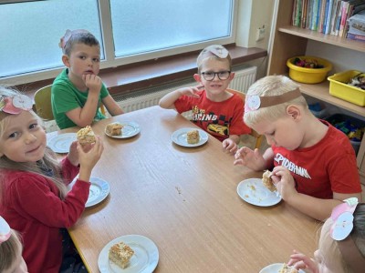 Nie zabrakło też słodkich przyjemności – zajadaliśmy się przepyszną szarlotką i babeczkami przygotowanymi przez rodziców. Na zakończenie dnia wspólnie przygotowaliśmy świeży sok jabłkowy, a na pamiątkę wykonaliśmy piękne zdjęcia, które długo będą przypominać te radosne chwile.
