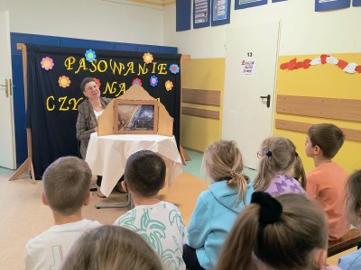 Następnie dzieci rozwiązywały zagadki związane z biblioteką i czytelnictwem. Po krótkiej pogadance z uczniami na temat zasad korzystania z biblioteki szkolnej nastąpiło uroczyste pasowanie na czytelnika i ślubowanie po czym uczniowie wypożyczyli swoją pierwszą książkę.