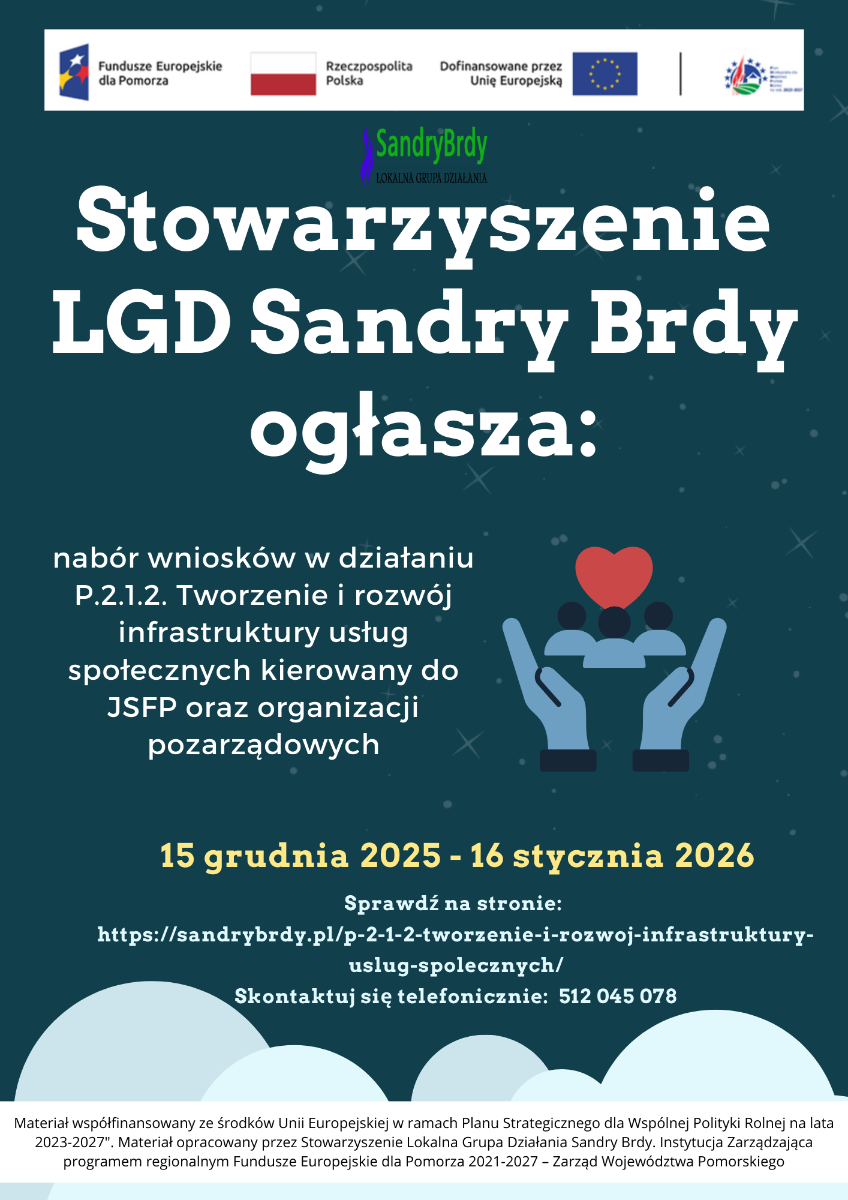 Informujemy, że do 16 stycznia 2026 r. trwa nabór wniosków w konkursach ogłoszonych przez Stowarzyszenie LGD Sandry Brdy: