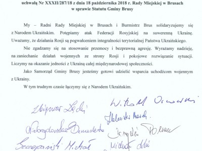 My – Radni Rady Miejskiej w Brusach i Burmistrz Brus solidaryzujemy się z Narodem Ukraińskim. Potępiamy atak Federacji Rosyjskiej na suwerenną Ukrainę. Uważamy, że działania Rosji są pogwałceniem integralności terytorialnej Państwa Ukraińskiego. – tak brzmi wstęp oświadczenia, które Rada Miejska w Brusach i Burmistrz Brus wystosowali pierwszego dnia wojny. Samorząd i mieszkańcy gminy Brusy od początku jednoczą się z napadniętą przez Rosję Ukrainą.
