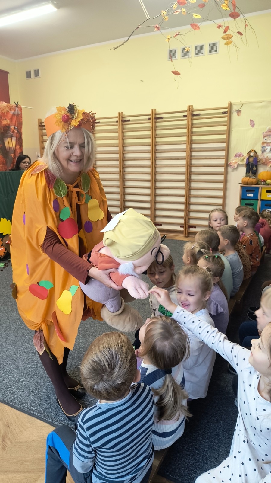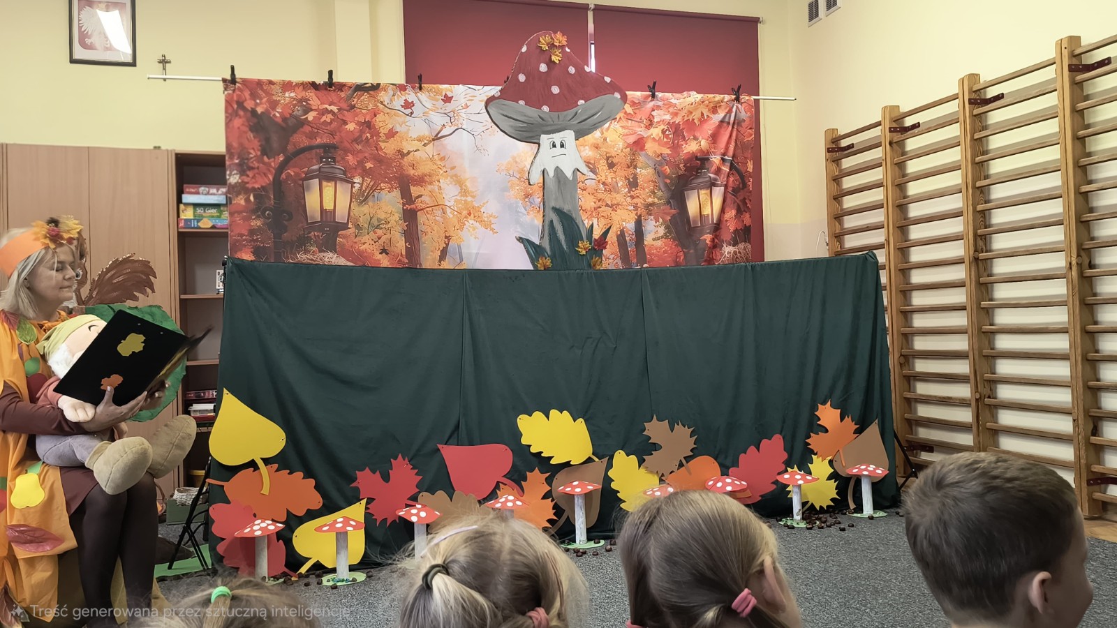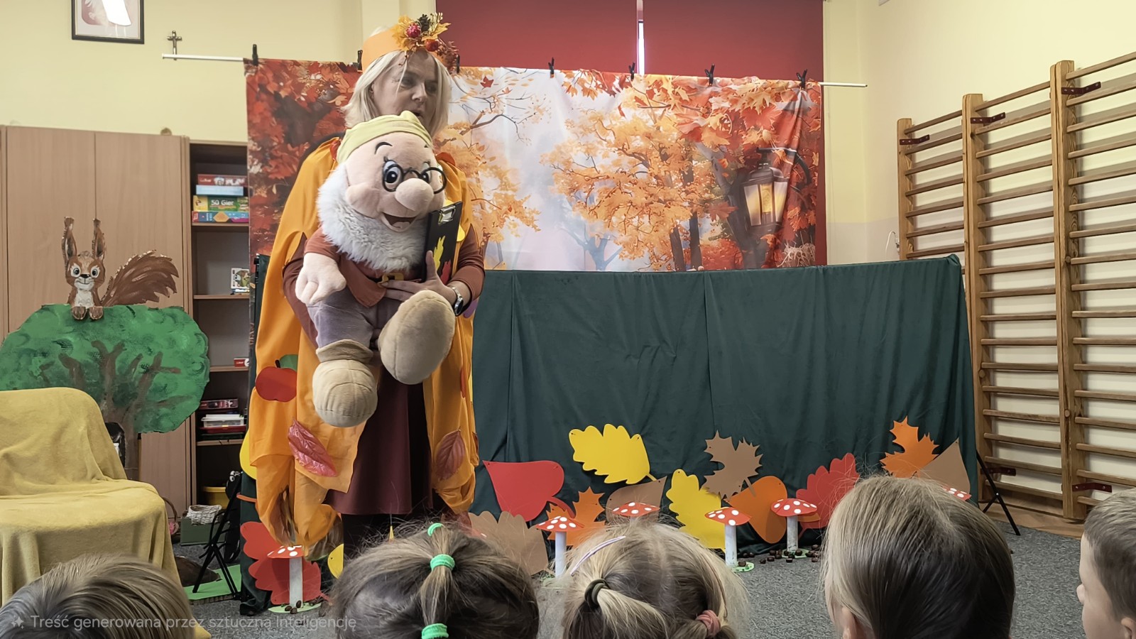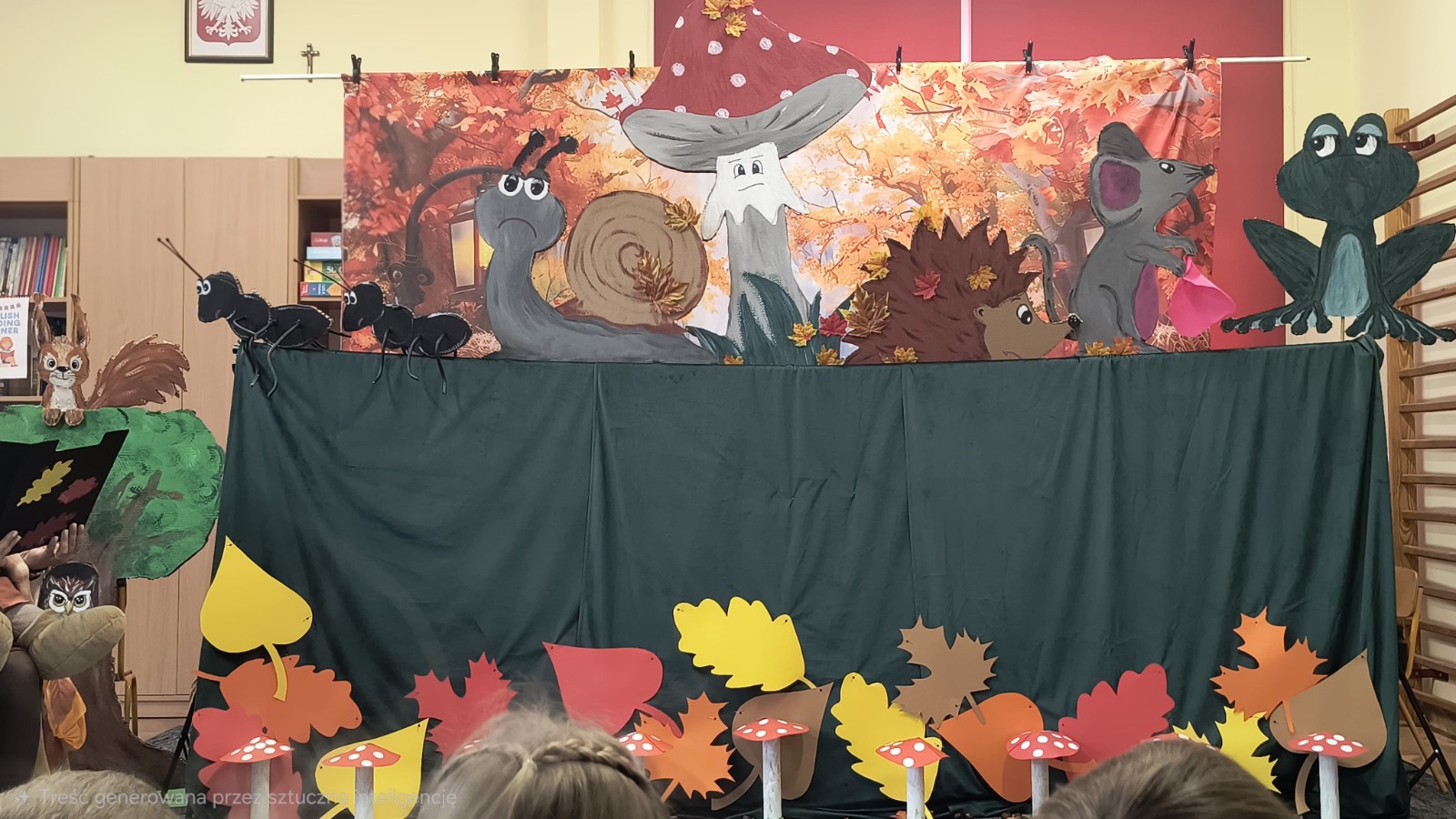 W październiku dzieci z Przedszkola nr 1 w Brusach mogły obejrzeć wyjątkowe przedstawienie "Dom pod Muchomorkiem" . Postaciom występującym w spektaklu głosu użyczyły nauczycielki, które od samego początku ukryte były za dekoracją. Jedyną osobą, która witała dzieci i była jednocześnie narratorem była pani Brygida. To właśnie ona wspólnie z Krasnalem rozpoczęła opowieść o przyjaźni pomiędzy mieszkańcami lasu. Na występ zaproszone zostały wszystkie grupy z przedszkola oraz uczestnicy Środowiskowego Domu Samopomocy w Brusach. Sądząc po minach gości i gromkich brawach jesteśmy pewni, że przedstawienie się spodobało.