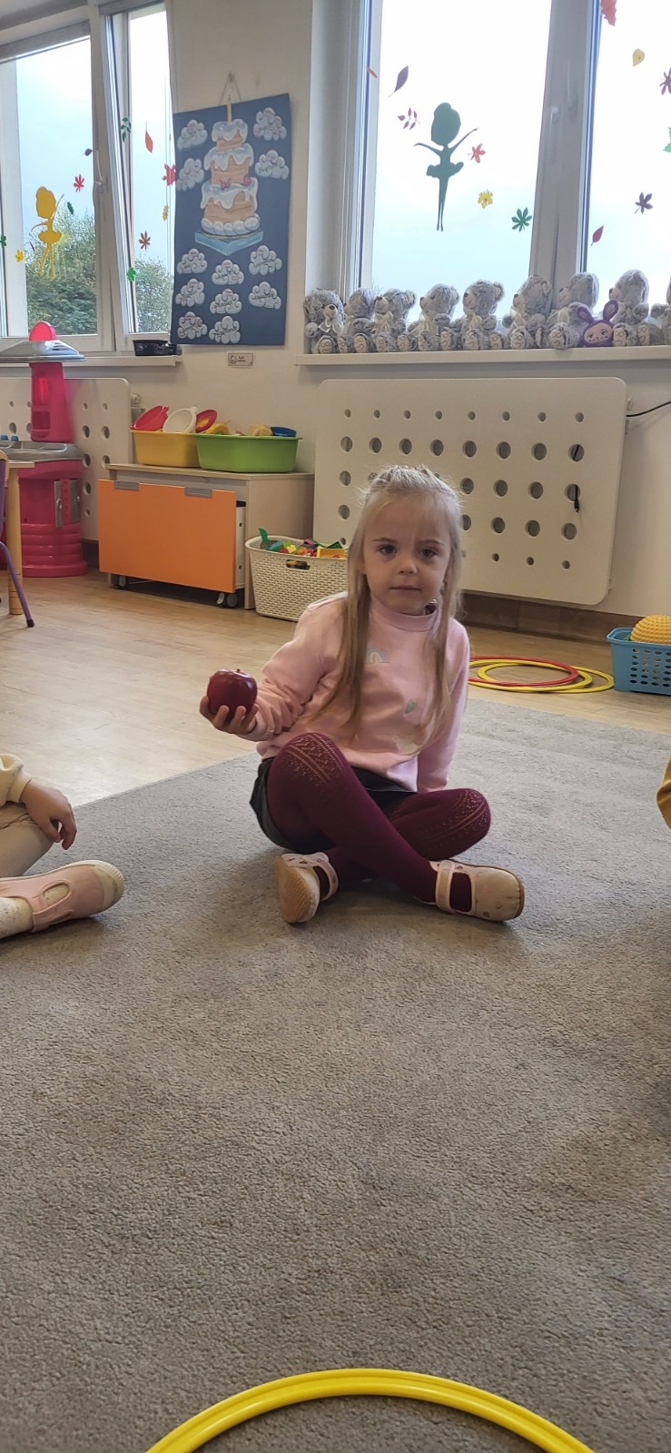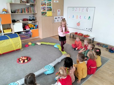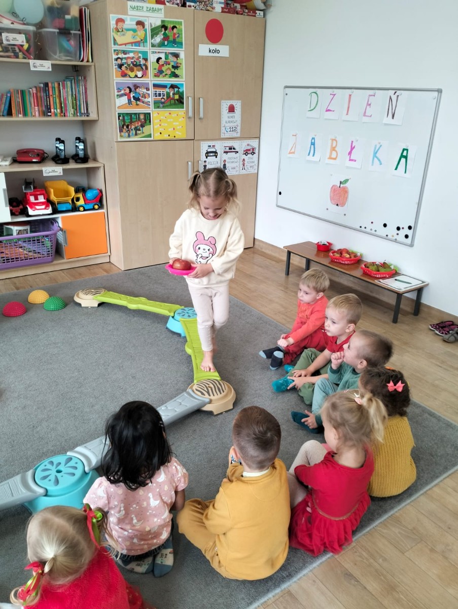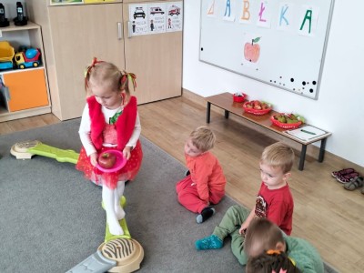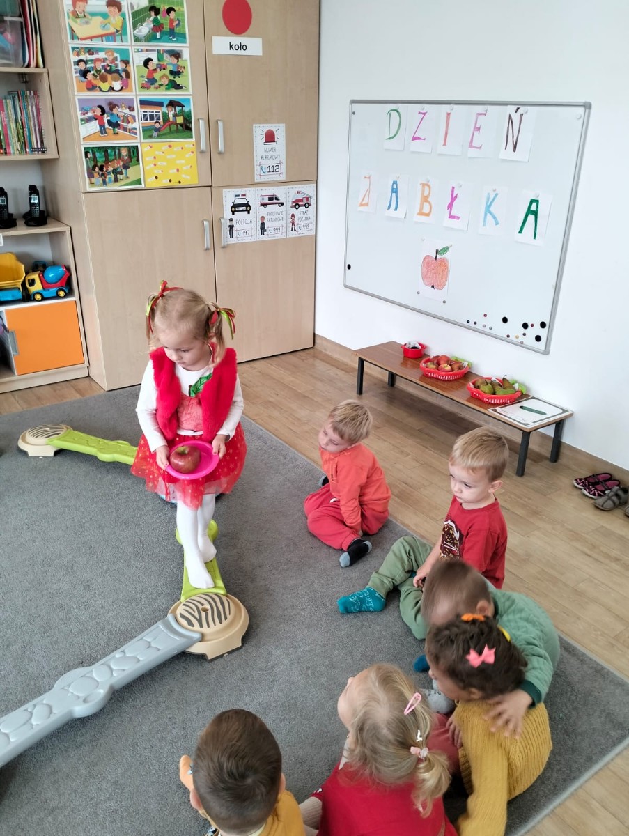 Po krótkiej rozmowie dzieci wykonały jabłuszkowy taniec, podczas którego dzieci z radością poruszały się w rytm muzyki, naśladując spadanie jabłek z drzew i ich turlanie się po sadzie.