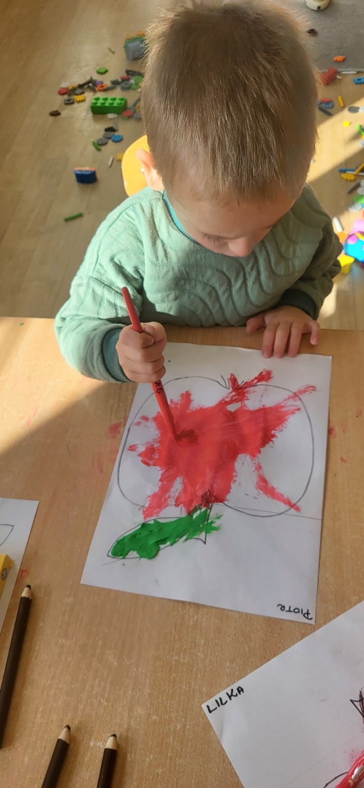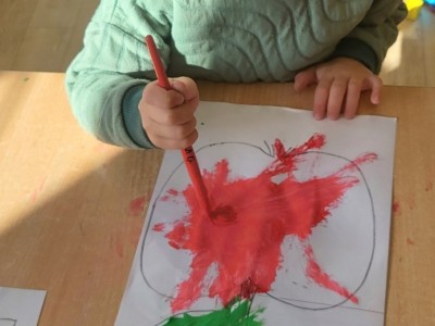 Kolejnym punktem programu był czas na pracę plastyczną – dzieci pomalowały jabłka czerwoną farbą, a zielone listki wykonały, rozcierając plastelinę, dzięki czemu powstały piękne, barwne prace, które ozdobiły naszą salę.