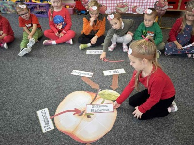 Poznaliśmy i zaśpiewaliśmy wesołą piosenkę „Jabłuszko”, rozmawialiśmy o tym, dlaczego warto jeść jabłka, jakie znamy odmiany, gdzie można je spotkać i kupić, a także z czego składa się jabłko. Dzieci utrwalały swoją wiedzę, dopasowując elementy budowy jabłka do ilustracji.
