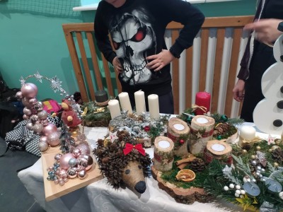 Zapach chlebka w wielu odsłonach unosił się w sali, naturalne kule do kąpieli w wielu zapachach oraz herbatka z pomarańczą , pyszne ciasteczka domowej roboty , pierogi, swojskie ciasto, przyprawa do piernika i różne odsłony piernika, to wszystko można było zakupić na naszych stoiskach. Fantastycznym pomysłem okazała się sprzedaż waty cukrowej i zupy owocowej. Wiele pozytywnych emocji wzbudziła loteria świąteczna, a licytowane przedmioty były bardzo atrakcyjne.