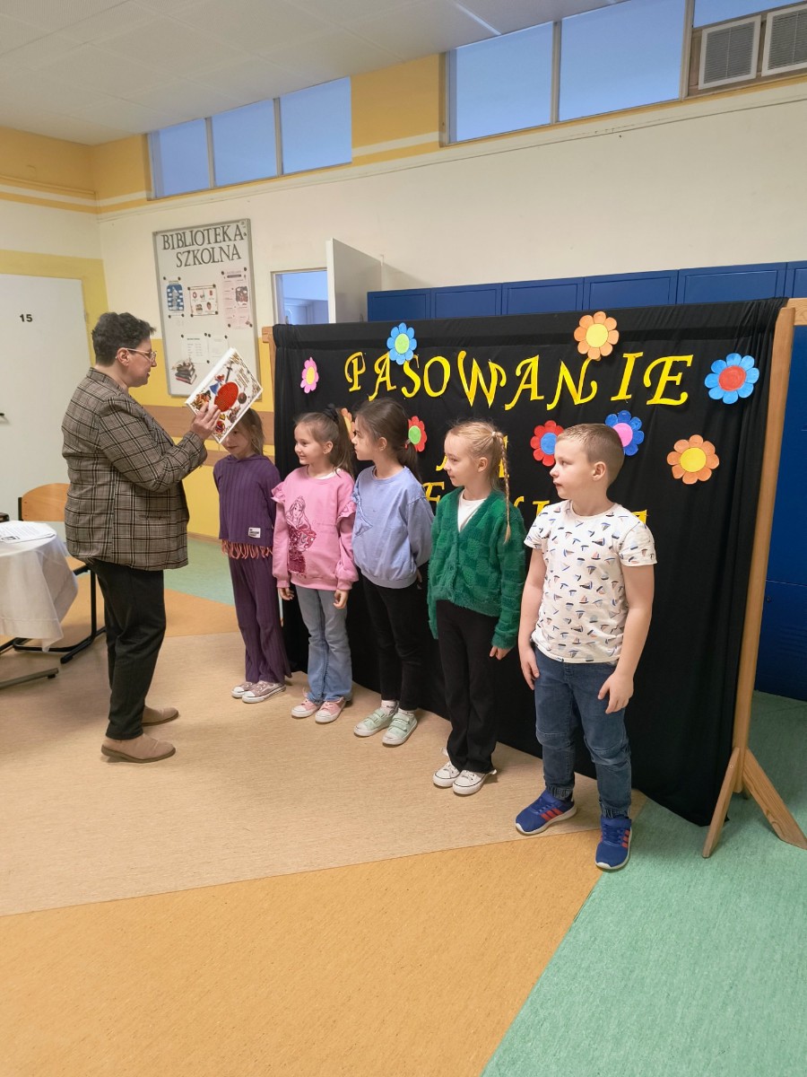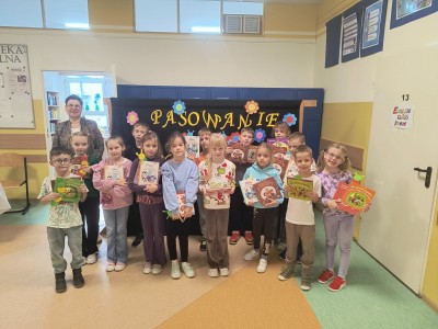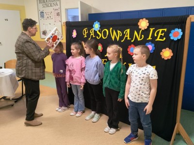 Następnie dzieci rozwiązywały zagadki związane z biblioteką i czytelnictwem. Po krótkiej pogadance z uczniami na temat zasad korzystania z biblioteki szkolnej nastąpiło uroczyste pasowanie na czytelnika i ślubowanie po czym uczniowie wypożyczyli swoją pierwszą książkę.